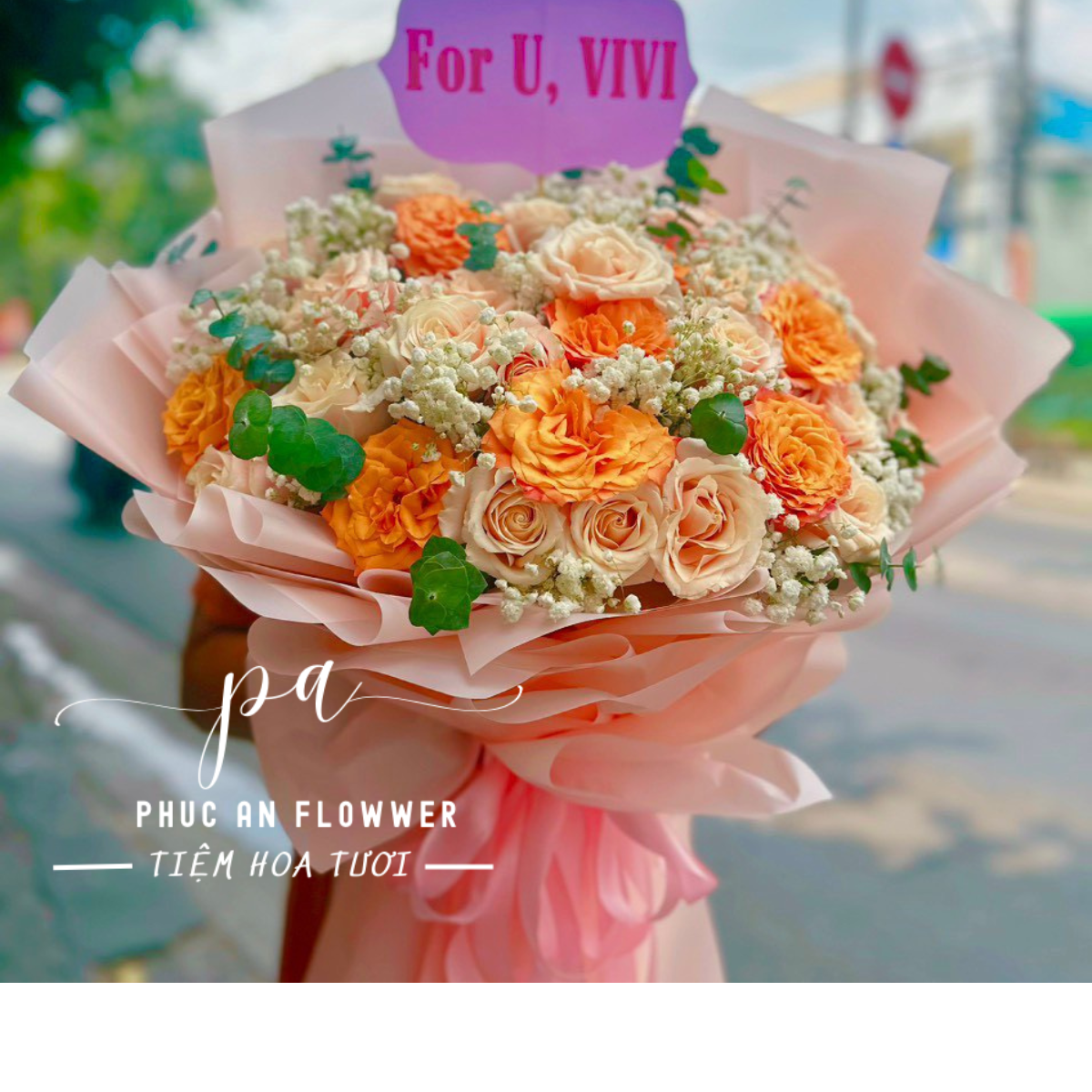 Sắc cam rực rỡ hòa cùng những đóa hồng kem dịu dàng tạo nên tổng thể vừa ấm áp vừa ngọt ngào. Những cánh hồng xoáy tròn mềm mại đan xen cùng baby trắng tinh khôi và lá xanh điểm xuyết, tất cả được ôm trọn trong lớp giấy hồng pastel sang trọng. Bó hoa như một tia nắng chiều ấm áp, đủ khiến trái tim người nhận khẽ rung lên ngay từ ánh nhìn đầu tiên.