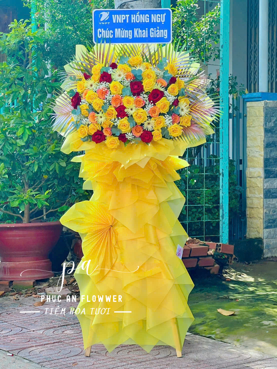 Kệ hoa chúc mừng nổi bật với sắc vàng tươi chủ đạo từ hoa hồng vàng, hoa đồng tiền và những bông hoa điểm sắc cam – đỏ nổi bật. Thiết kế tròn đầy, tỏa rộng cùng phần lá trang trí xòe phía sau tạo nên cảm giác rạng rỡ và tràn đầy năng lượng. Lớp giấy gói vàng nhiều tầng mềm mại giúp tổng thể kệ hoa trở nên nổi bật, sang trọng và rất thu hút trong những dịp chúc mừng đặc biệt.