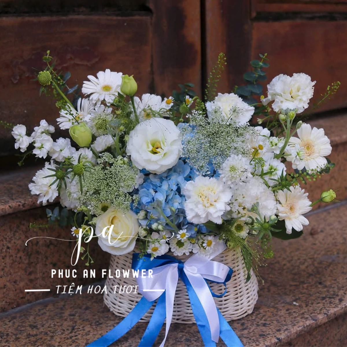 Sự hòa quyện tinh tế giữa sắc trắng thuần khiết của hoa cúc, hoa hồng kem và điểm nhấn xanh dịu dàng của cẩm tú cầu mang đến một tổng thể thanh lịch, nhẹ nhàng và đầy tinh khôi. Lẵng hoa được thiết kế trong giỏ mây xinh xắn cùng chiếc nơ xanh trang nhã, tạo nên cảm giác tươi mát như một làn gió dịu dàng giữa những ngày bận rộn.