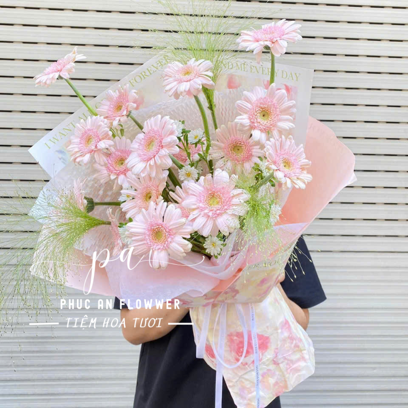 Bó hoa mang vẻ đẹp nhẹ nhàng và bay bổng với những đóa đồng tiền hồng pastel tươi tắn vươn cao tự nhiên. Sắc hồng dịu dàng hòa cùng những nhánh hoa nhỏ và lá xanh mềm mại tạo nên tổng thể thanh thoát, trong trẻo như một làn gió mùa xuân. Lớp giấy gói hồng phấn cùng thiết kế phóng khoáng giúp bó hoa trở nên trẻ trung, tươi sáng và đầy sức sống.