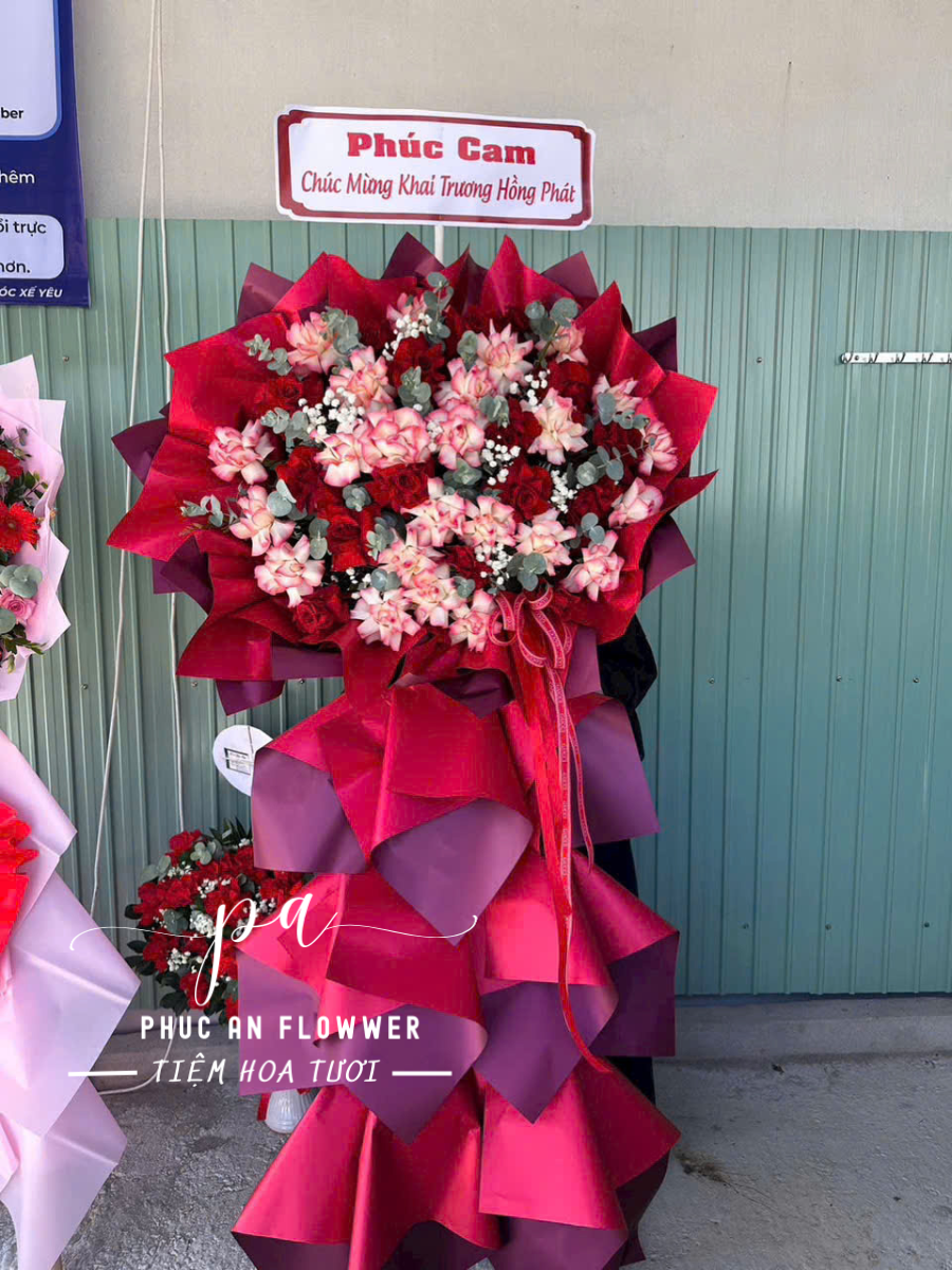 Kệ hoa mang sắc đỏ rực rỡ điểm xuyết những đóa hoa kem hồng dịu dàng, tạo nên tổng thể vừa nổi bật vừa thanh lịch. Những bông hồng đỏ được sắp xếp đan xen cùng hoa cẩm chướng nhạt và hoa điểm trắng nhỏ, mang đến cảm giác tròn đầy và sung túc. Lớp giấy gói đỏ phối tím được xếp tầng mềm mại như những lớp sóng lụa, giúp kệ hoa trở nên sang trọng và thu hút trong không gian ngày khai trương.