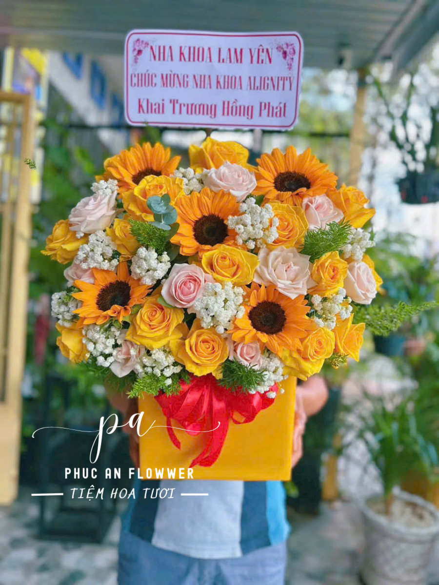 “Hướng Dương Ngược Nắng” tượng trưng cho tinh thần mạnh mẽ và luôn hướng về phía ánh sáng dù ở bất kỳ hoàn cảnh nào. Giỏ hoa mang thông điệp về sự kiên định, niềm tin và những khởi đầu tốt đẹp, rất thích hợp để gửi lời chúc thành công, phát triển và thịnh vượng trong các dịp khai trương hoặc chúc mừng đặc biệt.