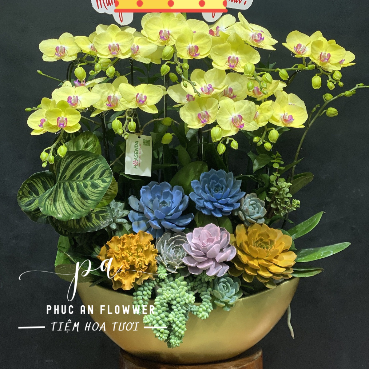 Chậu lan hồ điệp nổi bật với sắc vàng tươi rực rỡ, tượng trưng cho tài lộc, thịnh vượng và khởi đầu hanh thông. Những cánh lan tròn đầy, nở đều trên các cành vươn cao mềm mại, kết hợp hài hòa cùng sen đá đa sắc và lá cảnh nghệ thuật, tạo nên tổng thể vừa sang trọng vừa hiện đại. Sự phối trộn màu sắc tinh tế mang ý nghĩa phúc – lộc – an – khang, rất được ưa chuộng trong các dịp trọng đại.
