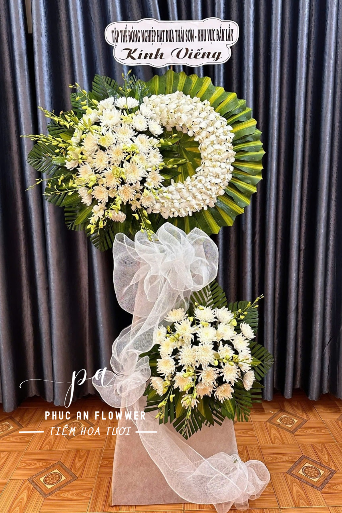 Kệ hoa chia buồn nổi bật với thiết kế vòng nguyệt quế trắng kết từ lan hồ điệp và cúc kem trang nhã, ôm trọn nền lá xanh bản lớn tạo chiều sâu vững chãi. Sự kết hợp giữa sắc trắng tinh khôi và xanh trầm mang đến cảm giác trang nghiêm, thanh khiết và đầy thành kính trong giờ phút tiễn biệt.