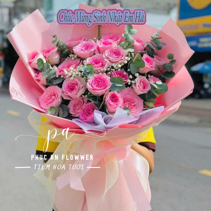 Bó hoa nổi bật với những đóa hoa hồng hồng tươi tắn được sắp xếp đầy đặn, tạo nên vẻ đẹp ngọt ngào và nữ tính. Sắc hồng nhẹ nhàng kết hợp cùng những chùm hoa baby trắng và lá bạc xanh mang đến cảm giác mềm mại, tinh tế. Lớp giấy gói hồng pastel thanh lịch càng làm tôn lên vẻ đẹp dịu dàng, khiến bó hoa trở nên cuốn hút và đầy lãng mạn.