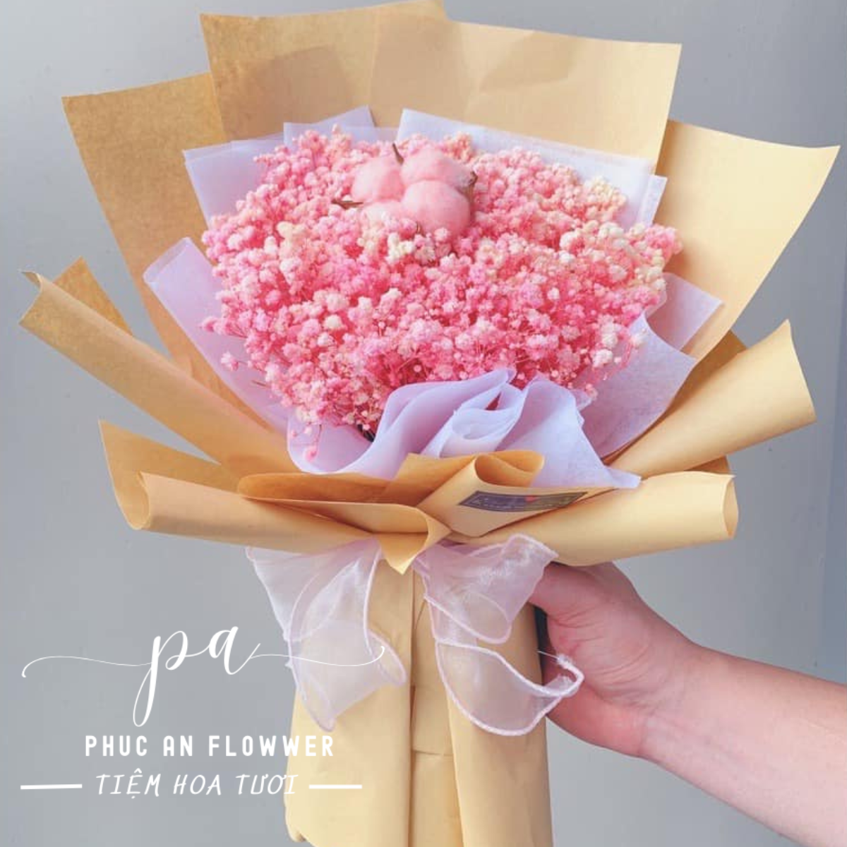 Bó hoa baby nhuộm hồng mang vẻ đẹp nhẹ nhàng và đầy thơ mộng, như một đám mây nhỏ ngập tràn sắc hồng ngọt ngào. Những bông baby li ti kết lại tạo nên tổng thể mềm mại, tinh khôi, được điểm xuyết bởi vài quả cotton hồng xinh xắn ở trung tâm, mang lại cảm giác ấm áp và dễ thương. Lớp giấy gói tông vàng kem kết hợp cùng nơ voan trắng làm bó hoa trở nên nổi bật nhưng vẫn giữ được nét thanh lịch.