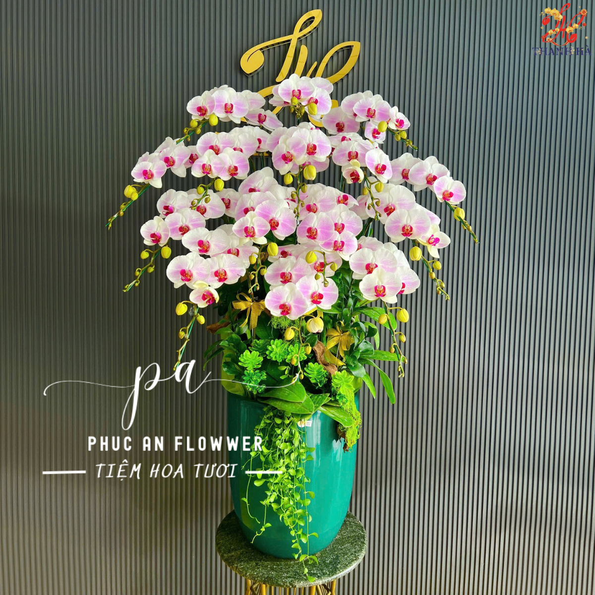 Chậu lan hồ điệp trắng pha hồng dịu dàng bung nở cân đối như một mái vòm viên mãn, tượng trưng cho sự sum vầy, đủ đầy và hạnh phúc bền lâu. Sắc trắng tinh khôi hòa cùng tâm hồng rực rỡ tạo nên tổng thể thanh cao mà vẫn nổi bật, rất phù hợp đặt tại đại sảnh, phòng khách sang trọng hoặc không gian khai trương cần điểm nhấn mềm mại nhưng đẳng cấp.