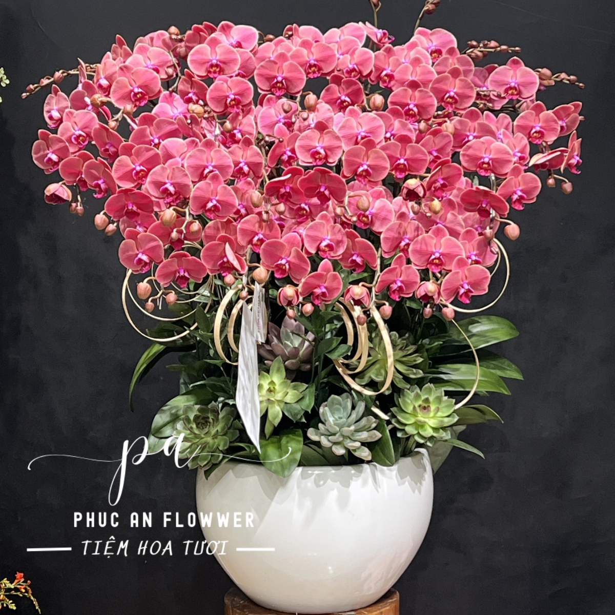 Chậu lan rất phù hợp để chúc mừng khai trương, kỷ niệm thành lập, mừng thăng chức, tặng đối tác lớn hoặc trưng bày sảnh công ty, showroom cao cấp. Tổng thể thiết kế vừa quyền quý vừa hiện đại, gửi gắm lời chúc làm ăn phát đạt, hồng phát dài lâu và vạn sự hanh thông.