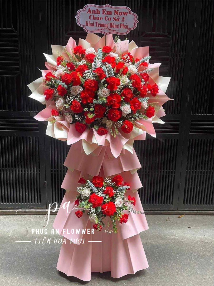 Kệ hoa khai trương nổi bật với sắc đỏ rực rỡ của những đóa hồng đỏ tươi thắm kết hợp cùng hoa hồng kem thanh nhã và những nhánh baby trắng tinh khôi. Tổng thể được thiết kế tròn đầy, bung nở mạnh mẽ trên nền giấy gói hồng pastel mềm mại, tạo nên sự hài hòa giữa vẻ sang trọng và nét trẻ trung hiện đại.