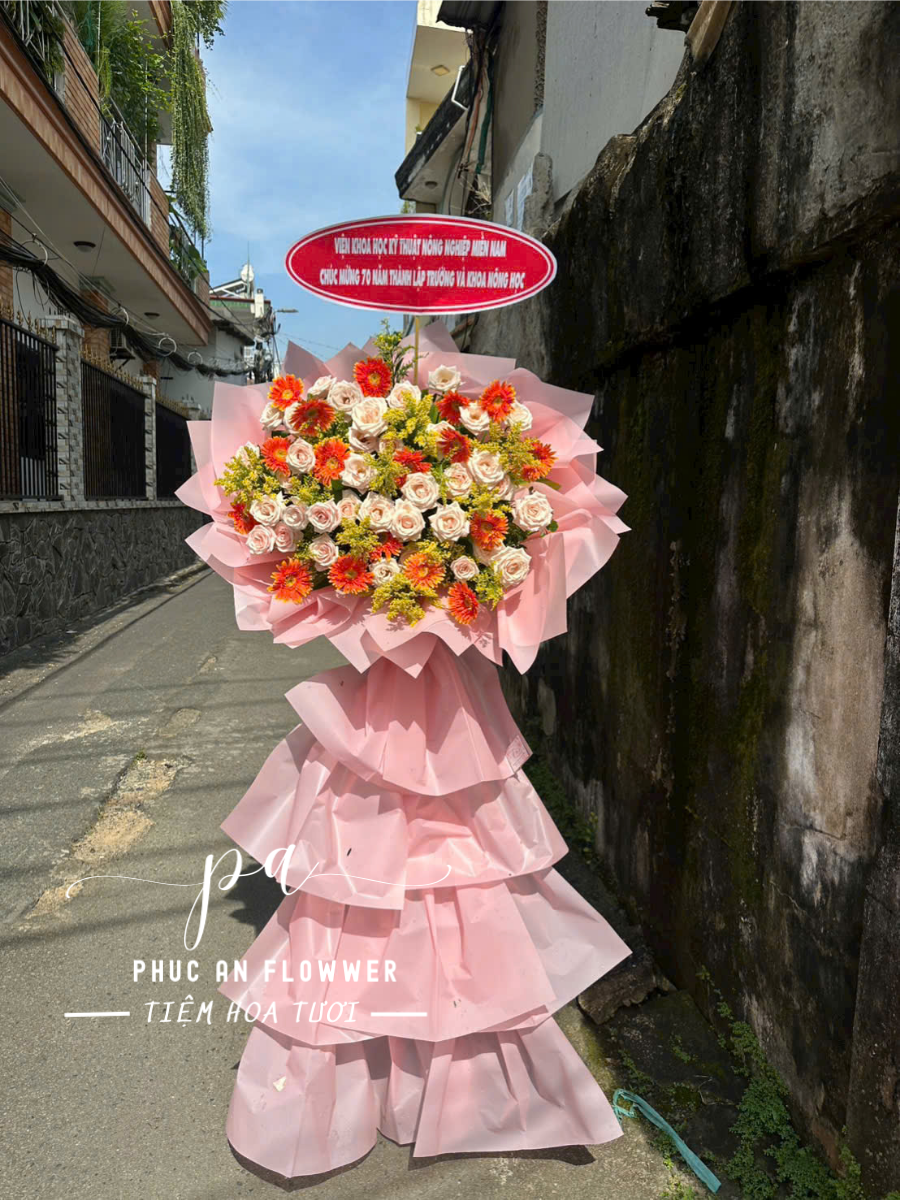 Kệ hoa khai trương nổi bật với sự kết hợp tươi sáng giữa hoa hồng kem thanh lịch, hoa đồng tiền cam rực rỡ và điểm xuyết những nhánh hoa vàng nhỏ xinh. Tổng thể bó hoa được thiết kế tròn đầy, hài hòa trên lớp giấy gói hồng pastel mềm mại, mang đến cảm giác trẻ trung, rực rỡ và đầy sức sống cho không gian ngày khai trương.