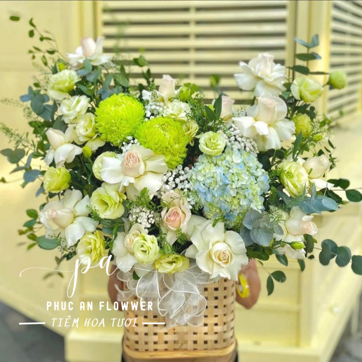 Giỏ hoa mang vẻ đẹp tinh khôi với sự kết hợp hài hòa giữa hoa hồng kem dịu dàng, cẩm tú cầu xanh nhẹ nhàng và những đóa cúc xanh tươi mát. Tổng thể tạo nên một gam màu thanh nhã, gợi cảm giác trong lành như buổi sớm mai, mang đến sự thư thái và dễ chịu cho bất kỳ không gian nào mà giỏ hoa hiện diện.