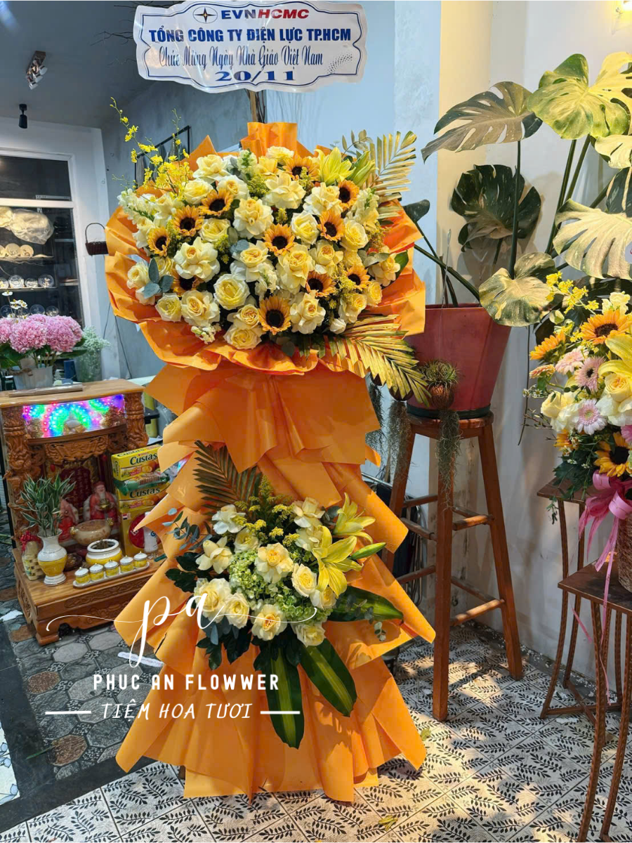 Kệ hoa nổi bật với sắc vàng rực rỡ của hoa hướng dương hòa quyện cùng hoa hồng vàng và những điểm nhấn lá trang trí hiện đại. Tổng thể được thiết kế tròn đầy, tỏa rộng trên lớp giấy gói cam vàng nổi bật, tạo nên vẻ sang trọng, ấm áp và đầy năng lượng cho không gian chúc mừng.