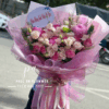 Bó hoa mang phong cách nhẹ nhàng – thanh lịch – đầy tinh tế, kết hợp hài hòa giữa hoa hồng hồng phấn, hồng vàng pastel, hoa tím nhẹ và hoa trắng, điểm xuyết lá bạch đàn xanh xám tạo cảm giác tươi mát và sang trọng. Tông màu pastel dịu dàng giúp bó hoa nổi bật nhưng không quá rực, rất phù hợp với những ai yêu sự tinh tế và trang nhã.